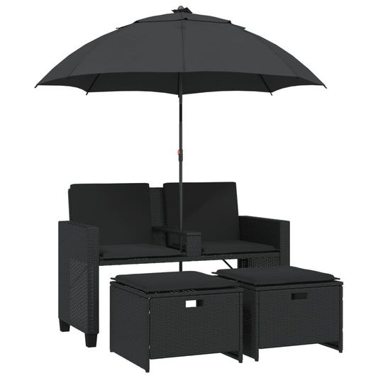 Gartensofa 2-Sitzer Sonnenschirm und Hocker Schwarz Poly-Rattan