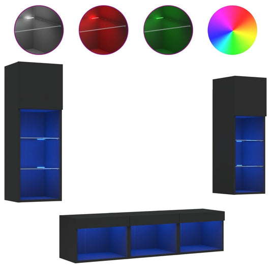 5-tlg. Wohnwand mit LED-Beleuchtung Schwarz Holzwerkstoff