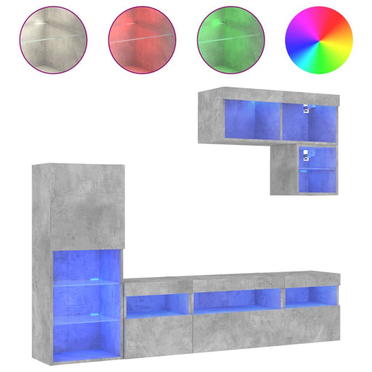 6-tlg. Wohnwand mit LED-Beleuchtung Betongrau Holzwerkstoff