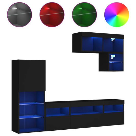 6-tlg. Wohnwand mit LED-Beleuchtung Schwarz Holzwerkstoff