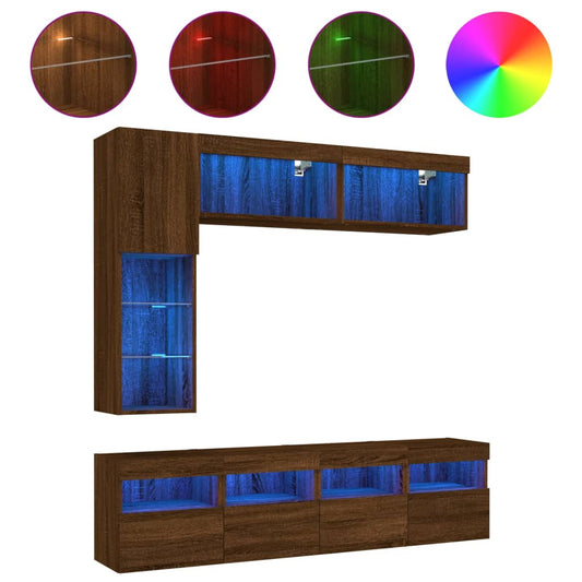7-tlg. TV-Wohnwand mit LED-Leuchten Braun Eichen-Optik