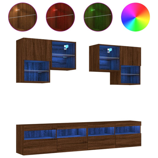 6-tlg. TV-Wohnwand mit LED-Leuchten Braun Eichen-Optik