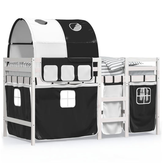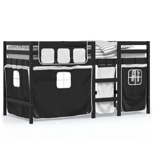 Kinderhochbett mit Vorhängen Weiß Schwarz 90x200 cm Kiefernholz