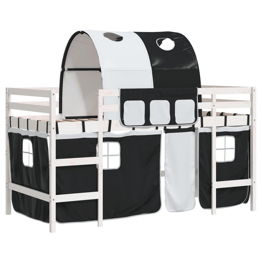 Kinderhochbett mit Vorhängen Weiß Schwarz 90x200 cm Kiefernholz