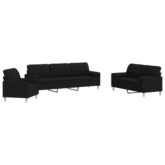 3-tlg. Sofagarnitur mit Dekokissen Schwarz Stoff
