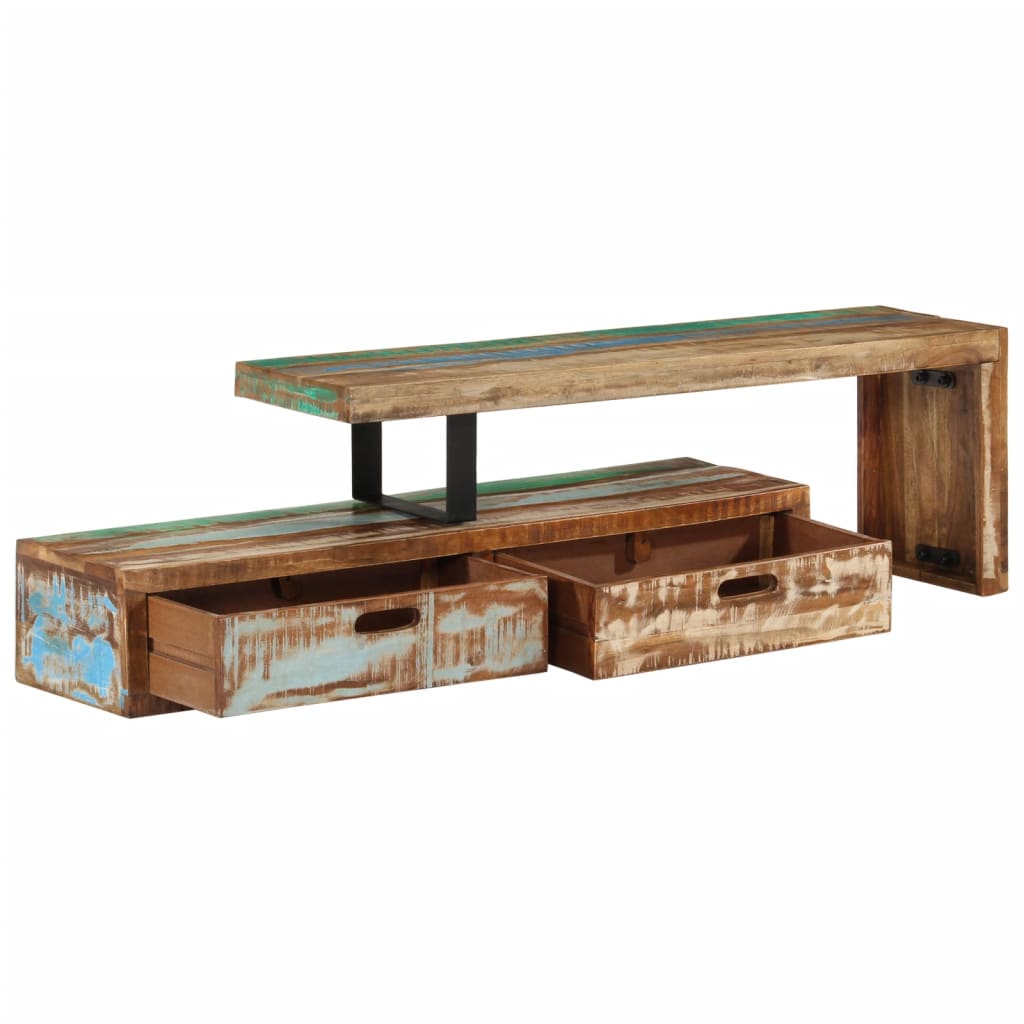 Mit seinem schlichten Design im Antik-Stil ist dieser TV-Tisch aus Holz eine großartige Bereicherung für dein Wohnzimmer. Massives Altholz: Massives Altholz besteht aus wiederverwendeten Holzarten wie Teakholz, Mangoholz, Kiefernholz und Buche. Diese Materialien werden aus alten Gebäuden wie Fabriken, Schuppen und Booten recycelt. Da jedes Stück handgefertigt ist, können die Farben bei jedem Produkt variieren.Reichlich Stauraum: Der TV-Schrank bietet reichlich Stauraum, um deine Zeitschriften, Bücher, Fernbedienungen und andere Kleinigkeiten gut organisiert und in Reichweite aufzubewahren.Präsentation: Die stabile Oberplatte des TV-Schranks bietet den idealen Platz, um Dekoartikel, Fotorahmen oder Topfpflanzen zur Schau zu stellen. Gut zu wissen:Um die Montage so einfach wie möglich zu machen, wird jedes Produkt mit einer Anleitung geliefert.Die Farben können von Artikel zu Artikel variieren, wodurch jedes Möbelstück einzigartig ist. Die Lieferung erfolgt nach dem Zufallsprinzip, wodurch die Exklusivität und Individualität deines Produkts gewährleistet wird.