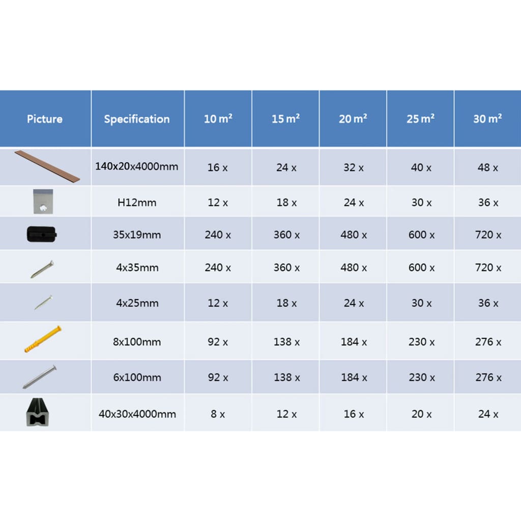 These WPC decking boards with accessories, which cover a total area of 10 square meters, are perfect for terraces, balconies or areas next to a pool or hot tub. Our decking boards made of high-quality wood-plastic composite material are waterproof and very durable. The decking boards have a thickness of 20 mm, making them extremely strong. In addition, these decking boards have a different pattern on each side. The delivery includes 16 decking boards, 8 keels, 240 plastic clips, 252 stainless steel screws, 92 plastic expansion screws and 12 stainless steel starter clips. This set is easy to assemble.