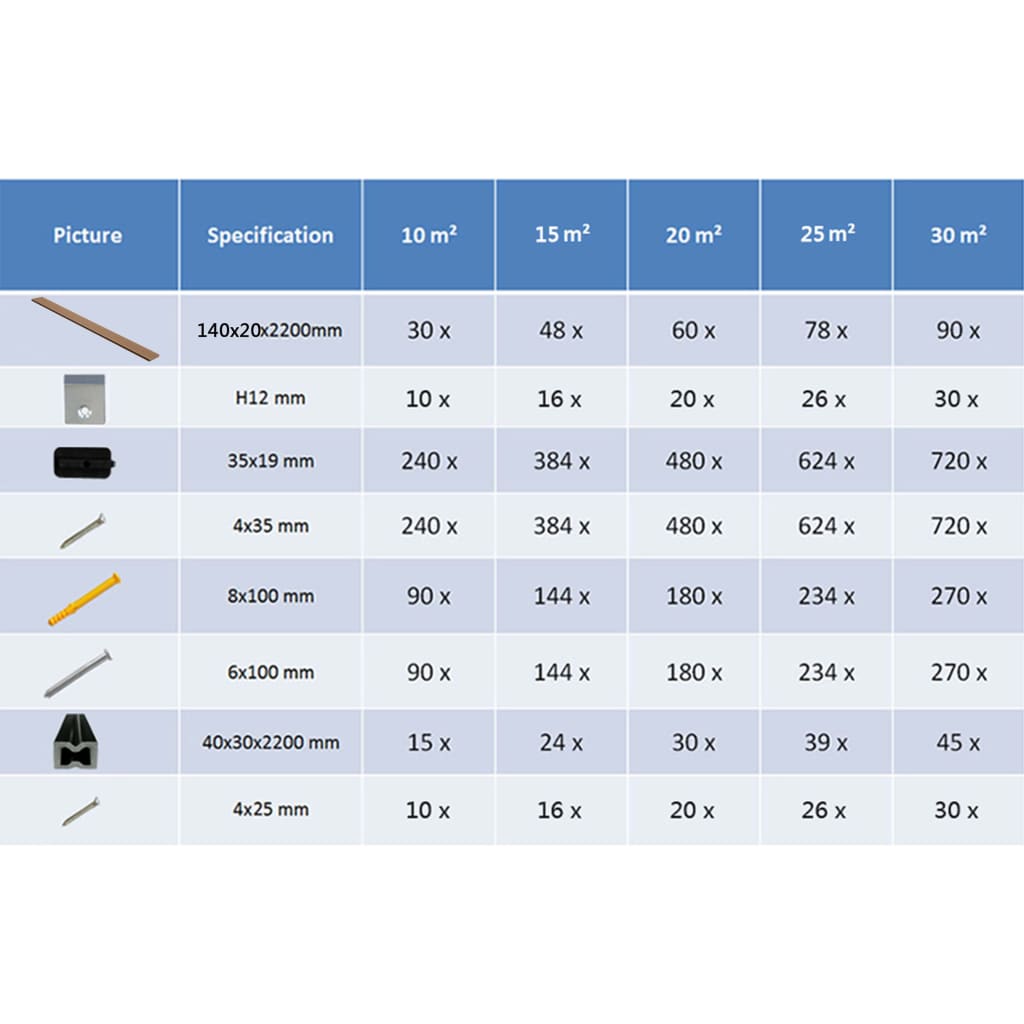 These WPC decking boards with accessories, which cover a total area of 16 square meters, are perfect for terraces, balconies or areas next to a pool or hot tub. Our decking boards made of high-quality wood-plastic composite are water-repellent and very durable. The decking boards have a thickness of 20 mm, making them extremely strong. In addition, these decking boards have a different pattern on each side. The delivery includes 48 decking boards, 24 keels, 384 plastic clips, 400 stainless steel screws, 144 plastic expansion screws and 16 stainless steel starter clips. This set is easy to assemble.