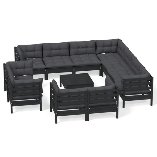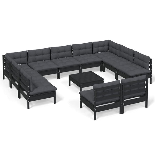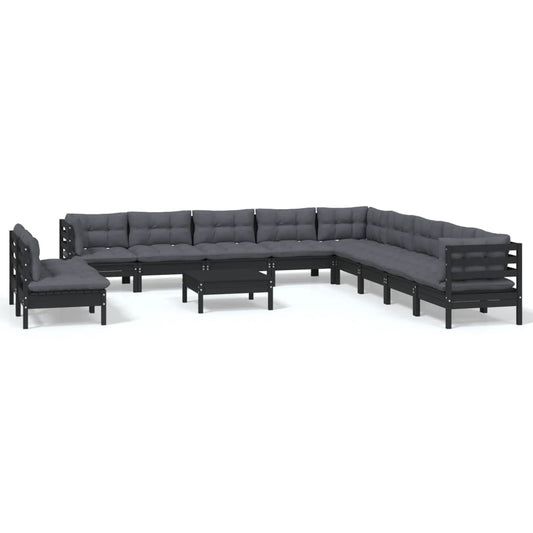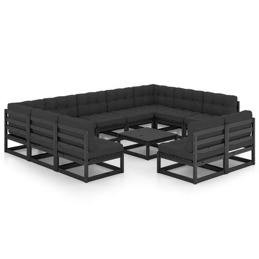 12-tlg. Garten-Lounge-Set mit Kissen Schwarz Kiefernholz