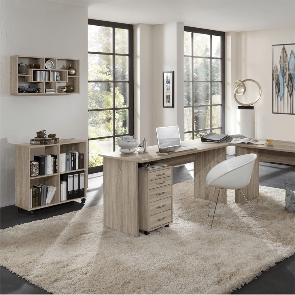 Suvremena samostojeća polica iz FMD-a je svestrana opcija za pohranu koja se sastoji od 4 odjeljka jednake veličine na dvije razine! Možete ga koristiti za pohranu dokumenata u uredu, jer okretni kotačići znače da svoje datoteke uvijek možete imati blizu sebe dok radite ili ga jednostavno možete napuniti svojim omiljenim knjigama i ukrasnim predmetima. Elegantna polica izrađena je od iverala presvučenog melaminom u toploj boji hrasta koja pristaje gotovo svakom stilu interijera.