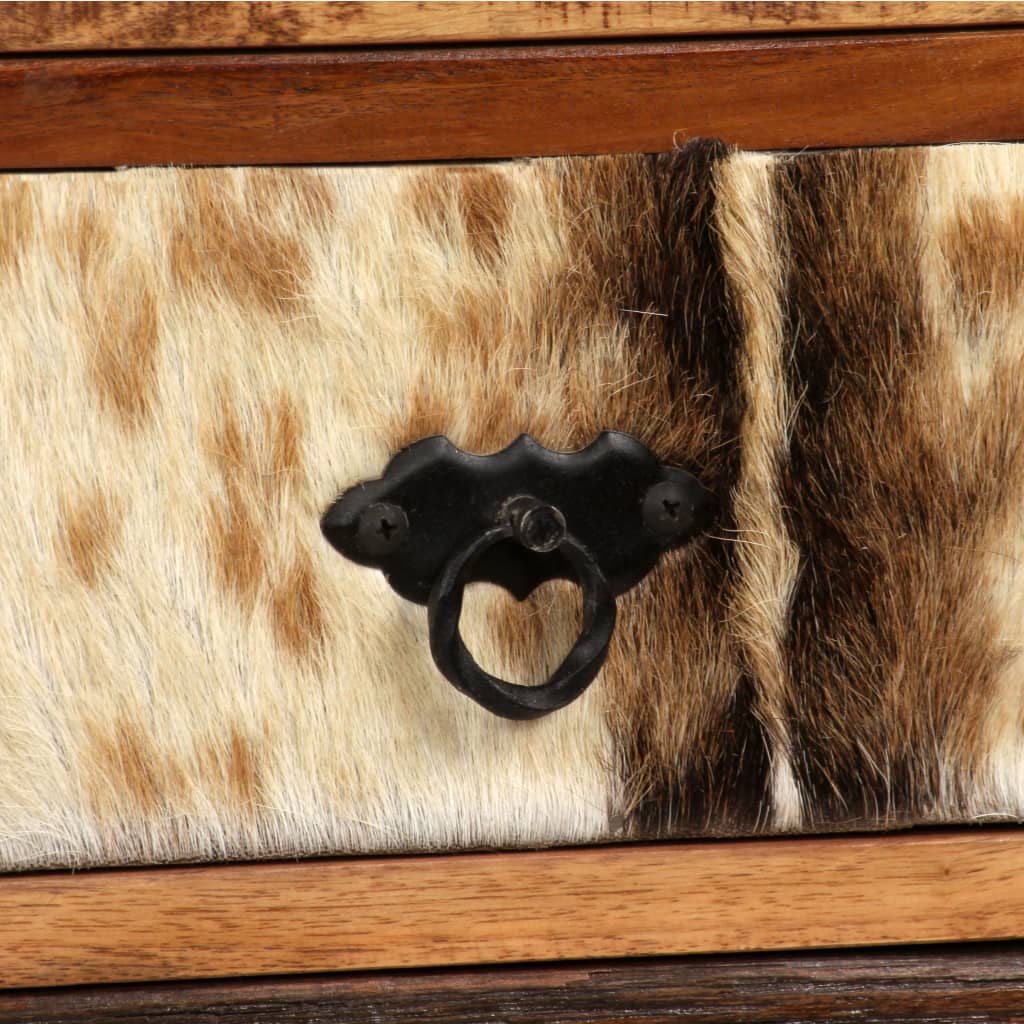 Naš elegantni komoda s detaljima od prave goveđe kože i ručno izrezbarenim ukrasima bit će bezvremenski dodatak vašem domu, dok ga jednako tako možete koristiti da organizirate svoje stvari i sklonite ih s puta. Komoda od punog drva je robusna, lako se čisti i vašem domu daje dašak rustikalnog šarma. Estetsko drveno zrno čini svaku našu komodu jedinstvenom. Ova jedinstvena komoda obiluje dekorativnim elementima, poput detalja od prave goveđe kože, ručno izrezbarenih ukrasa i retro stilskog ambijenta, koji ormariću daju jedinstveni šarm. Bočni ormarić podupiru čvrste čelične noge, koje također daju industrijski dojam. Sastavljanje je jednostavno. Važna napomena: detalji drva i goveđe kože razlikuju se od komada do komada, što svaku našu komodu čini jedinstvenom. Dostava je nasumična.